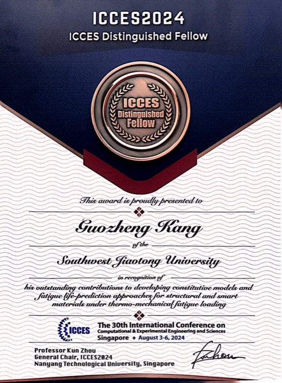 在本届会议中共有三位学者荣获ICCES Distinguished Fellow国际大奖,分别是来自浙江大学的陈伟球教授、365英国上市公司官网的康国政教授和四川大学的王清远教授。该奖主要是表彰康国政教授在热机械疲劳载荷下智能材料/结构本构模型和疲劳寿命预测方法方面做出的杰出贡献。