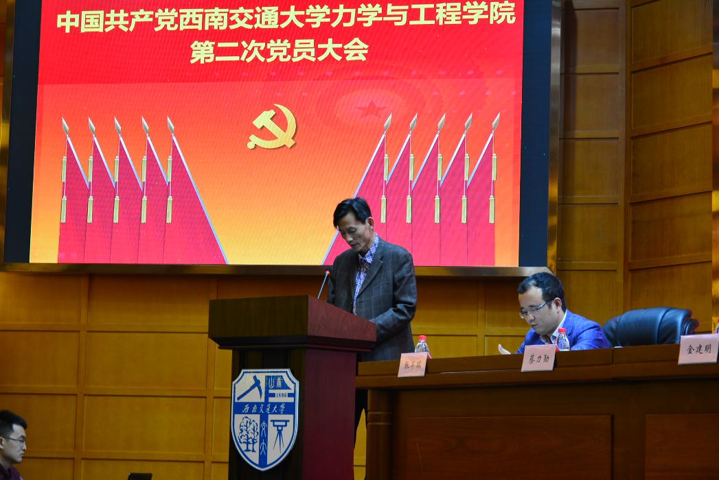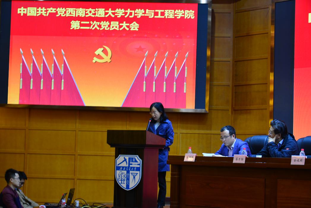 力学与工程学院党委书记金建明代表学院党委做工作报告,主题为《不忘初心,砥砺奋进,力争以优异成绩助力学院科学发展》。他指出,2011年至今5年来学院各方面工作迈上了新台阶,主要包括:党建和思想政治教育、高端人才引进、学科建设、科学研究、教育教学、人才培养、工会建设以及学生工作等各方面取得的新成绩。金建明代表学院党委,向为学院建设与发展付出辛勤劳动的老党员、老同志,向为学院建设与发展付出艰苦劳动的共产党员们,致以崇高的敬意!学院未来四年建设与发展的目标是:将学院建设成为国际知名、国内一流且在多个领域居领先地位的力学基础理论和工程应用技术研发基地和人才培养基地。在这一目标下,学院的工作重点是:推进“人才强院”战略,为改革发展提供人才支撑;进一步夯实学科发展基础,大力提升学术竞争力;创新人才培养体系,提高人才培养质量。金建明强调,学院各党支部和全体党员要继承和发扬一代又一代力学人“严谨治学、严格要求”的优良传统,不忘初心,砥砺奋进,以优异成绩助力学院科学发展!