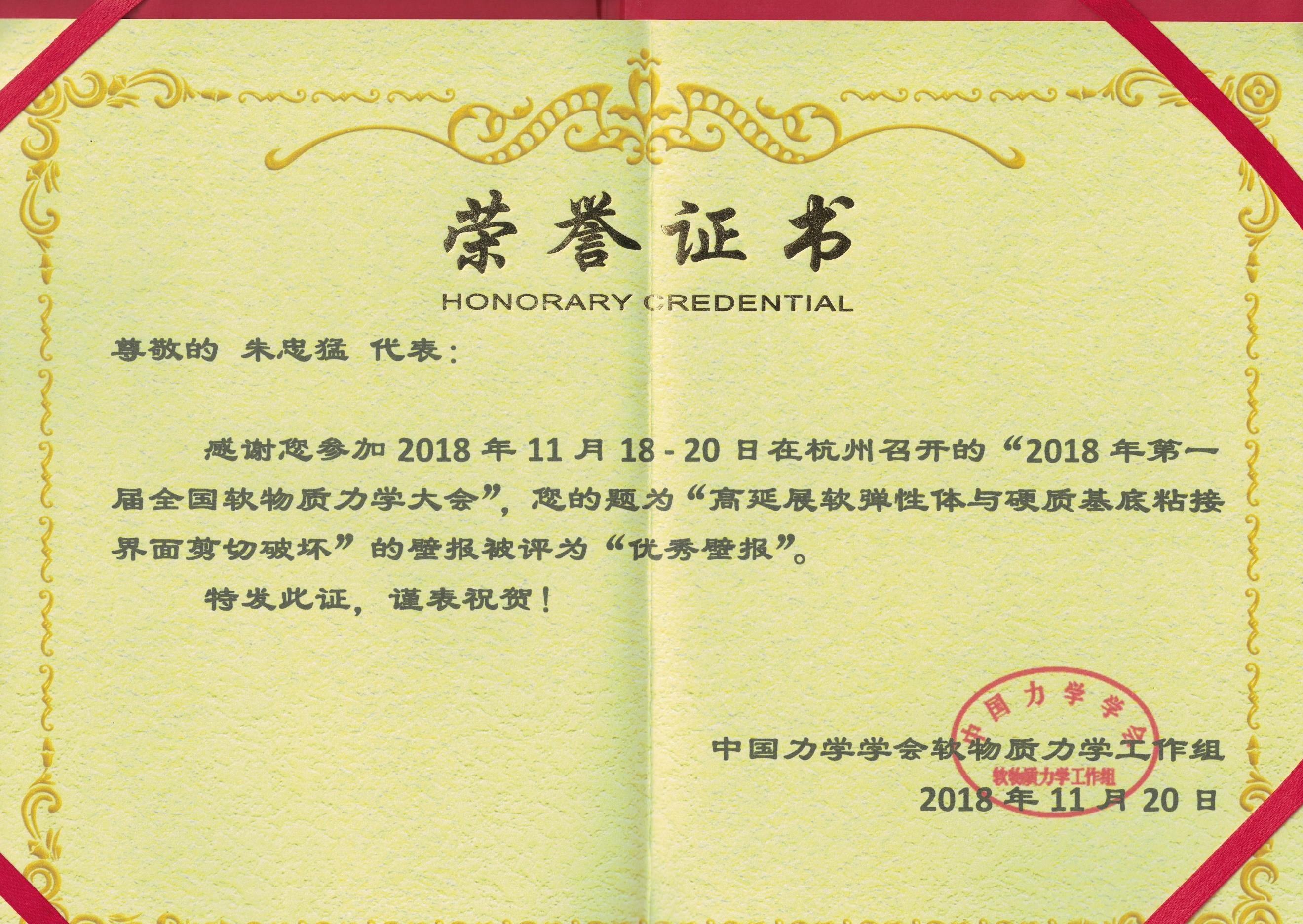 我院蒋晗教授与朱忠猛博士生参加了此次会议。在大会优秀壁报评选环节,我院朱忠猛博士与来自浙江大学、复旦大学、同济大学、北京理工大学、华南理工大学等高校的40位教师、研究生同台竞争,最终脱颖而出,成为第一届全国软物质力学大会“优秀壁报”奖的5名获奖者之一。