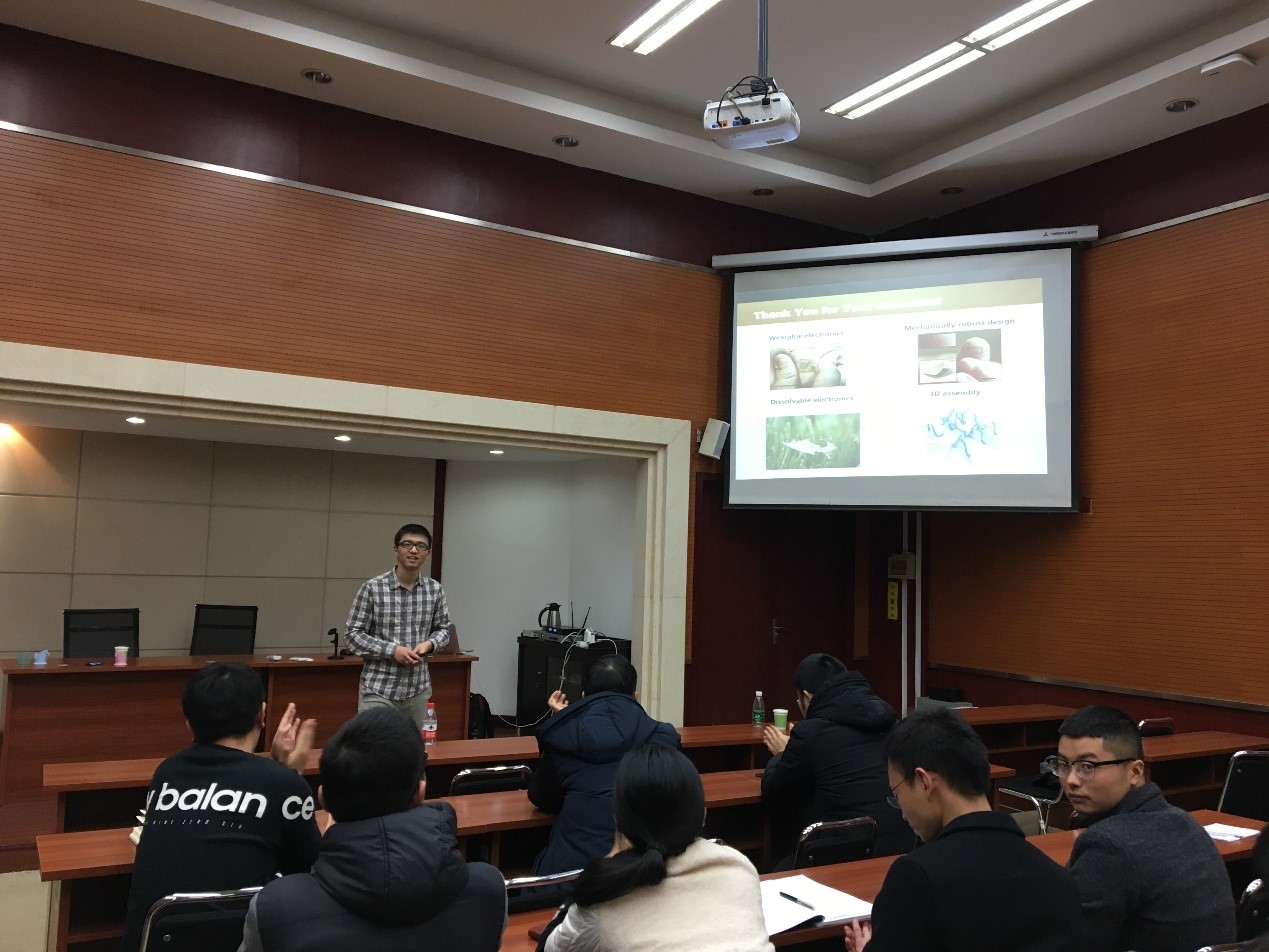 应我院袁江宏副教授的邀请,2018年12月19日下午,美国宾夕法尼亚州立大学程寰宇博士来我院进行学术交流,并作了题为“Dissolvable Tattoo Electronics for Biomedicine”的学术报告。程博士首先综述了柔性电子相关的前沿研究,包括先进转印技术、生物复合材料设计、多级微结构设计、三维组装等;接着重点介绍了可降解柔性电子的概念以及他近年来在可降解柔性电子方面的创新研究成果,包括可降解电子器件的力学设计及结构优化、可降解生物医疗传感技术、可降解集成电子等;最后对柔性电子尤其是可降解电子在人体健康监测及医疗等方面的潜在应用进行了展望。该报告引起了我院师生的浓厚兴趣,现场气氛活跃、讨论热烈。报告结束后,我院袁江宏老师与程寰宇博士就软材料与柔性结构设计等前沿课题进行了深入交流,并探讨了今后合作研究的可能性。程寰宇博士此行增进了365英国上市公司官网与国外知名高校之间的学术交流与合作,促进了我院的科研发展。