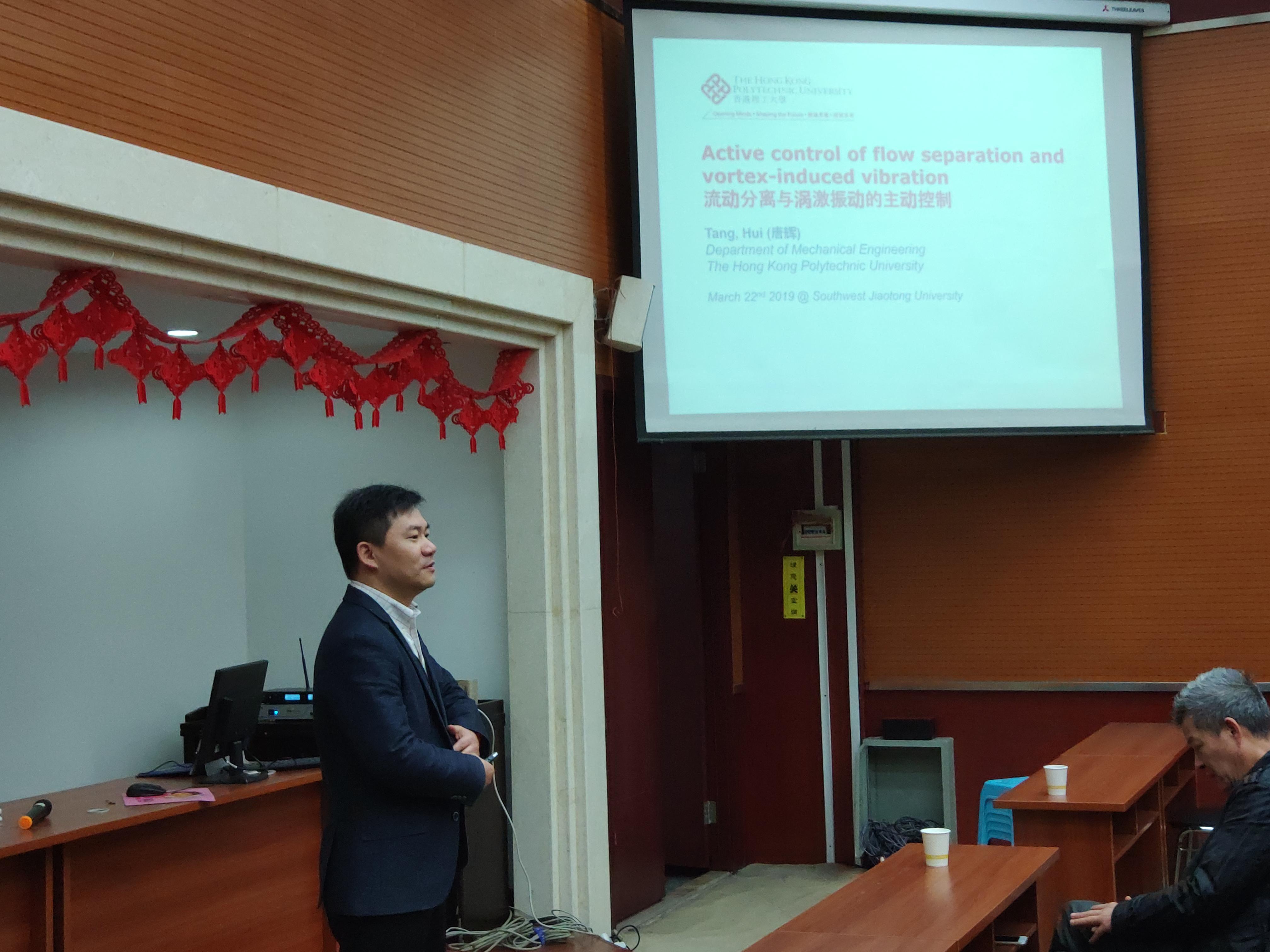 应力学与工程学院李鹏老师的邀请,香港理工大学唐辉副教授,于2019322日在九里校区行政楼240会议室,进行了题为“Active Control of Flow Separation and Vortex-induced Vibration”的专题讲座,并与322日下午在振动中心参与流固耦合课题组的组会讨论。我院研究生、博士生以及流固耦和相关方向导师参与了报告及交流。