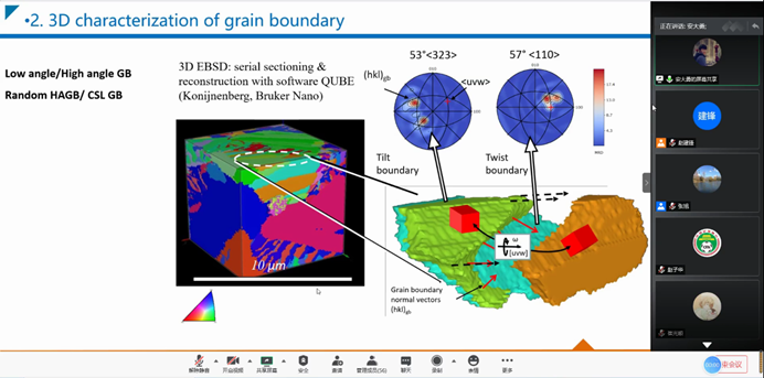此次学术讲座,安大勇副教授报道了Fe-17Mn-1.5Al-0.3C (wt.%)在低周疲劳下的微观组织演变过程以及利用原位ECCI(In-situ ECCI)技术和高分辨EBSD(HR-EBSD)技术研究不同加载参数以及氢对疲劳组织和疲劳性能的影响。安大勇副教授通过实验发现,高锰钢的疲劳形貌展现出典型的平面滑移的特征,及均匀的密集的滑移系开动。传统理论认为只有交滑移的开动的前提下,疲劳组织才能形成复杂的位错组态,然而实验发现在高锰钢低周疲劳加载后,复杂的位错组织(如位错墙)同样可以形成。在此基础上,安大勇副教授指出,位错墙是由两组具有相同共线性位错交互作用形成,同时位错墙的内部也会形成了位错偶极子,大大屏蔽了位错墙的长程应力。最后安大勇副教授总结了EBSD和ECCI技术在材料微观组织演化和性能预测方面的应用前景,并期待后续与365英国官网能够开展更进一步的交流合作。