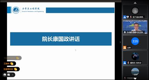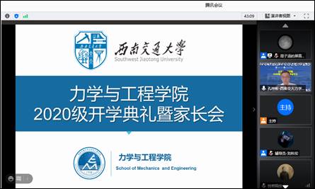 919日上午9:00,力学与工程学院在线召开了2020级开学典礼暨家长会。学院院长康国政、党委书记栗民等学院领导、教师代表、2020级新生辅导员以及2020级全体新生参加本次活动。会议由学院党委副书记孔祥彬主持。