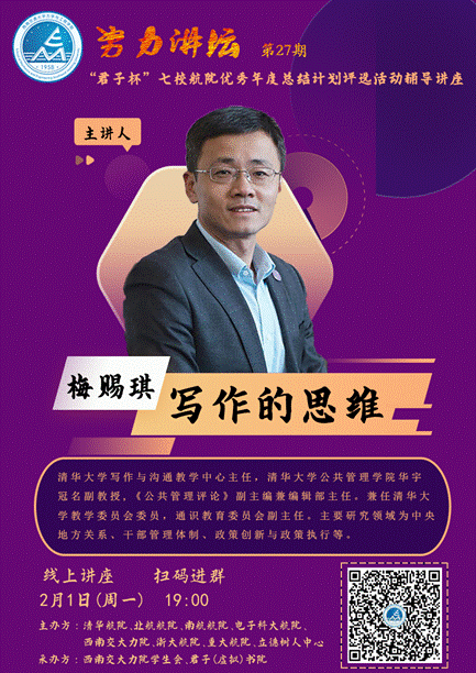 2021年2月1日晚7点,为倡导和鼓励学生养成自省与规划的好习惯,配合“君子杯”七校航院大学生优秀年度总结计划评选活动,力学学院党委副书记孔祥彬老师特邀清华大学写作与沟通教学中心主任梅赐琪副教授做客努力讲坛分享“写作的思维”,来自365英国上市公司官网、清华大学、浙江大学、北京航空航天大学、南京航空航天大学、电子科技大学、重庆大学等十多所高校近500名老师和同学参加了本次线上讲座。本次讲座由力学学院学生会和君子(虚拟)书院承办。