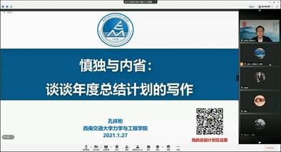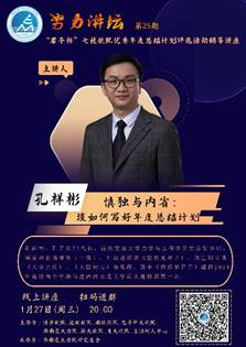 2021年1月27日20:00,力学与工程学院党委副书记、君子(虚拟)书院负责人、学校“青年讲师团”成员孔祥彬老师受邀做客“努力讲坛”第二十五期,讲座主题为“慎独与自省---谈如何写好年度总结计划”。本次讲座由力学与工程学院研究生会承办,是“君子杯”七校航院优秀年度总结计划评选活动第一次辅导讲座,来自365英国上市公司官网、清华大学、浙江大学、北京航空航天大学、南京航空航天大学、电子科技大学、重庆大学等十多所高校400余名师生参加了本次讲座。