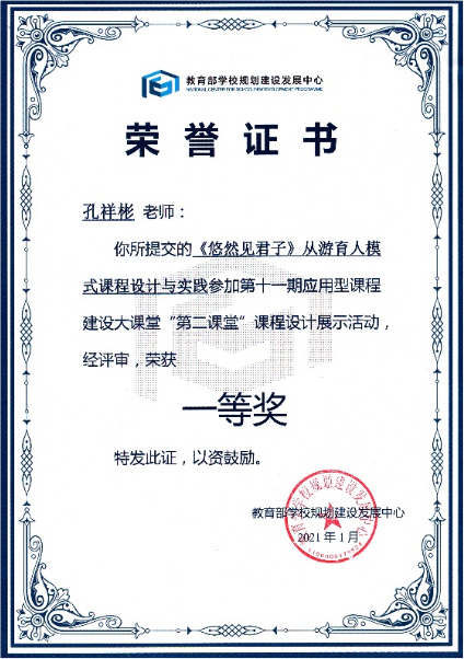 会议最后,举行了教育部第二课堂课程设计展示活动颁奖仪式。该展示活动于2020年12月16日在线上举行,孔祥彬老师以“<悠然见君子>从游育人模式课程设计与实践”为题进行了展示,获得评委一致好评,荣获一等奖。会议现场,教育部学校规划建设发展中心课程中心秘书长张振笋为孔老师颁发了证书。