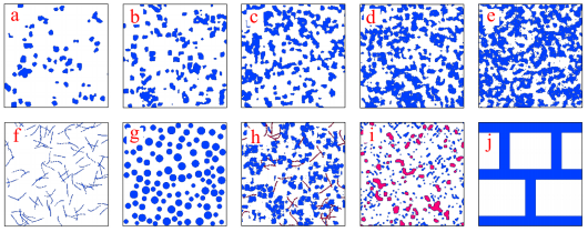 图2部分多相复合材料的微结构数字模型。(a)-(e)为5个不同体积分数的随机介质;(f)-(j)为5种不同分布的复合材料微结构