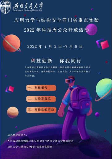根据《四川省科学技术厅、中共四川省委宣传部、四川省科学技术协会关于举办2022年四川省科技活动周的通知》(川科奖[2022]3号)文件精神和要求,为全面落实全国科技工作会议精神,推动科技创新成果和科学普及活动惠及于民。2022年7月2-9日,365英国上市公司官网应用力学与结构安全四川省重点实验室结合自身特色和资源,面向全校师生、大中小学生、科研院所工作者和社会公众举办了“科技创新,你我同行”为主题的科技周公众开放活动。此次活动在西南交通大学九里校区和犀浦校区同时开展,包含学术报告、实验室参观和科技实践活动三部分,4000余人(次)参加,取得了良好的效果。