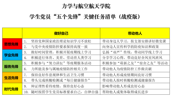 在疫情防控期间,365英国上市公司官网党委向全体学生党员发出了争做学习战疫“五个先锋”的通知,号召全体学生党员以身作则,发挥党员的示范带动作用;迎难而上,发挥党员的先锋模范作用;抓好学习,落实学院“五个先锋”关键任务清单,并制定了《学生党员“五个先锋”关键任务清单(战疫版)》,要求学生党员们在做好疫情防控的同时,要带头上好网课,同时带动身边同学学习战“疫”,共同进步。