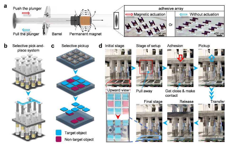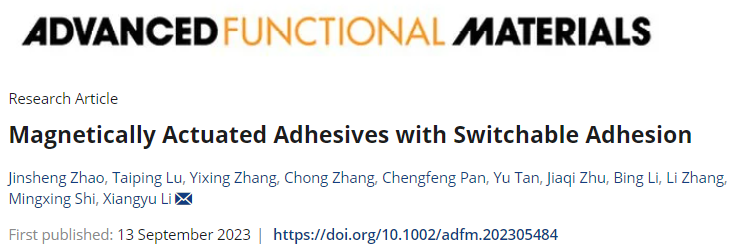 智能粘附材料具有粘附性快速切换、高调节比和精确控制的特性,在微操作和制造等领域具有巨大的应用潜力。尽管现有研究取得了重大进展,但是高效、稳健的智能粘附材料仍然缺乏。近期,李翔宇教授团队基于团队前期提出的通过在粘附界面人为地产生初始裂纹的方式实现粘附性的调控,开发和设计了一种利用外部磁场驱动磁性触手扭转变形以调控粘附性的智能粘附材料。这种智能粘附材料可以在小于1秒的响应时间内实现从强粘附到弱粘附的调控,调节能力超过50倍。相关研究成果以“Magnetically actuated adhesives with switchable adhesion”为题发表在Advanced Functional Materials上。