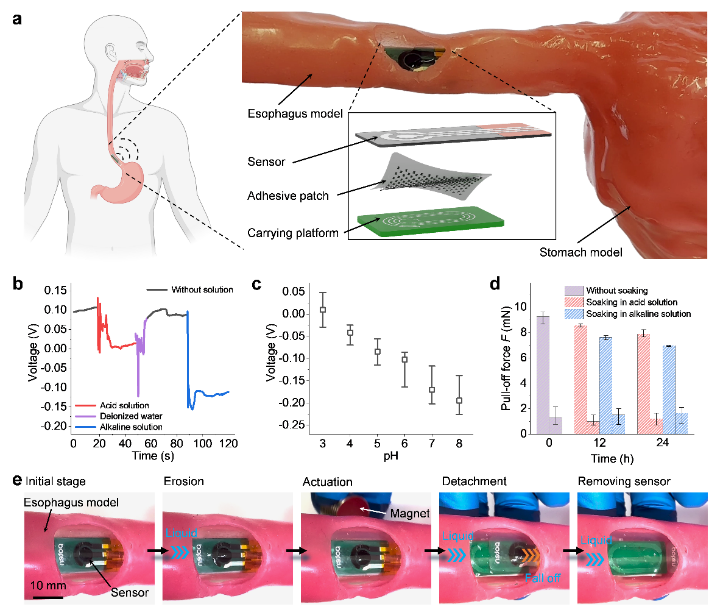 磁驱动粘附材料在选择性拾取和拾取与放置两种工作模式下可以实现粘附性调控范围为50倍(磁场强度在300mT内)和30倍(磁场强度在400mT内)。磁驱动粘附材料可以被开发用于平整和弯曲表面物体的拾取和放置,例如研究人员开发设计的具有点对点功能的选择性拾取装置,如图2所示。磁驱动粘附材料也可以应用于按需脱附的应用场景。例如,生物体内需要定期更换的电子元件,在外部磁场的驱动下,粘贴有磁驱动粘附材料的电子元件从体内的集成平台按需脱附,实现对体内电子元件的非侵入式的操控。如图3展示了食道内用于检测胃反酸电子元件的按需脱附操作。