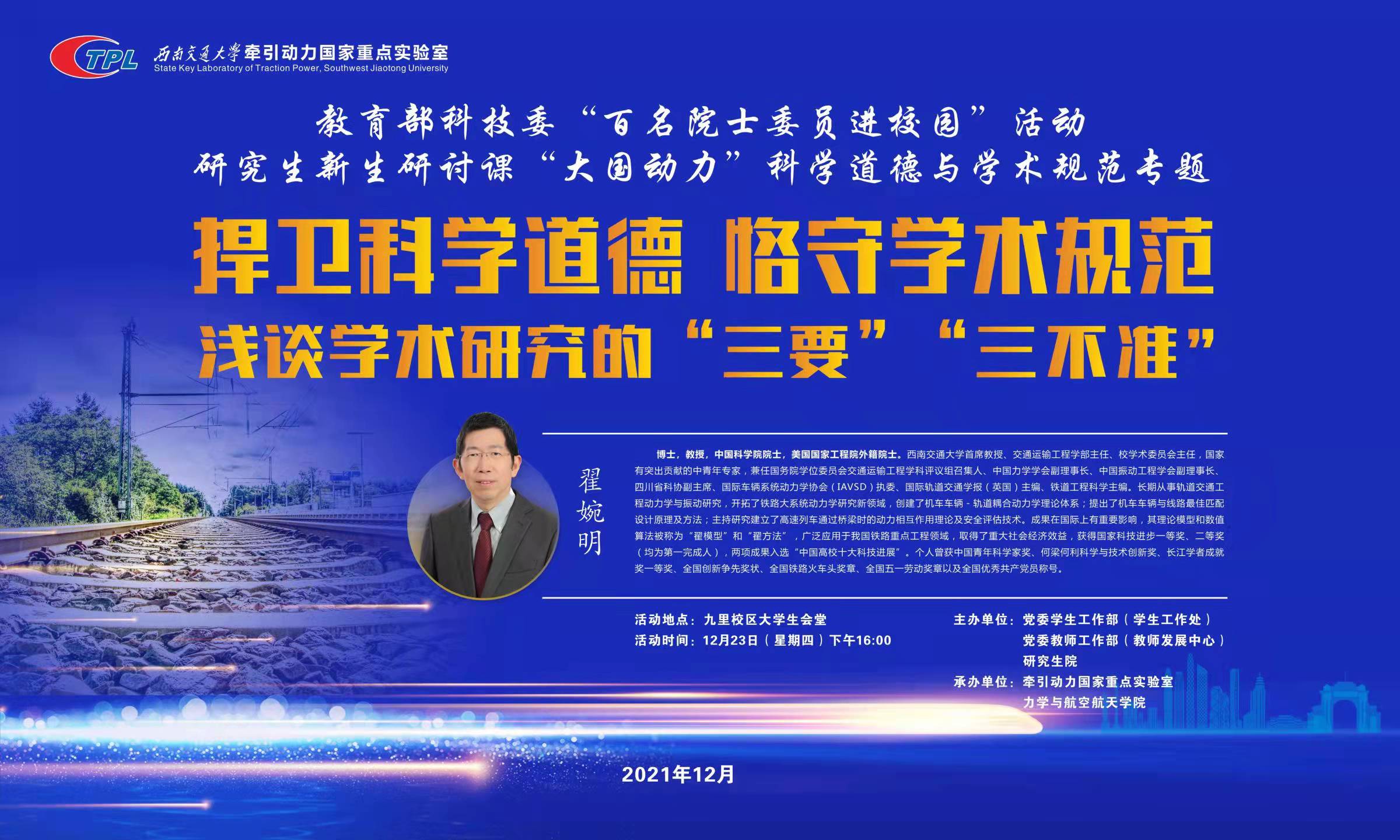 为进一步做好365英国官网研究生学术规范和学术道德教育,引导广大研究生遵守学术规范、严守学术诚信,由党委学生工作部(学生工作处)、党委教师工作部(教师发展中心)、研究生院主办,牵引动力国家重点实验室、365英国上市公司官网承办,特邀中国科学院院士、美国国家工程院外籍院士翟婉明教授开展“捍卫科学道德 恪守学术规范”专题讲座。现就相关事宜通知如下: