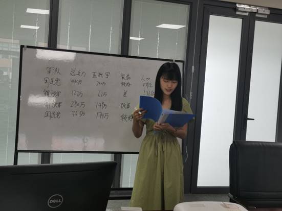 苏欢同学对抗日战争后全面内战相关内容进行了讲述。她以时间轴为主线向大家一一对比了各个时期国民党和共产党总兵力、辖区内人口数量以及经济实力的变化,详细介绍了辽沈战役、淮海战役及平津战役这三大战役,对比分析了中国共产党是如何在硬件实力较为落后的情况下,最终一步步赢得内战的胜利,从而证明马克思主义中国化才是正确的道路。